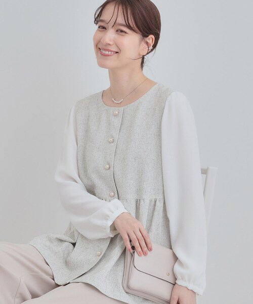 【デザイン】ベストとブラウスを重ね着したかのような異素材使いブラウス。時短できれい見えコーデが決まります。身頃は柔らかいツイード調のカットソー素材、お袖部分は柔らかいブラウス素材を使用しています。ウエスト高めの位置の切り替え、裾に向けてふわっと広がるペプラムデザインにすることで、女性らしいスタイリッシュな印象になります。前あき仕様で着やすく、きちんと感がありながら長時間着用してもきれい見えが続く便利なアイテムです。【スタイリング】上品でフェミニンな印象のアイテムですが、ボトム合わせでいろんなシーンに着用が可能です。切り替え位置がやや高めなのでパンツでもスカートでもバランスよく決まります。すっきりした素材感のテーパードパンツやワイドパンツや、サテンプリーツスカートならセレモニー時期やお仕事にぴったりです。時短できっちり見えコーデが叶います。【素材】身頃は柔らかなツイード調のカットソー素材、お袖は肌当たりよいブラウス素材を使用しています。※照明の関係により、実際よりも色味が違って見える場合があります。また、パソコン・スマートフォンなどの環境により、若干製品と画像のカラーが異なる場合もございます。#通勤#セレモニー#ママスーツ#入卒#卒園式#卒業式#入学式#入園式#学校訪問服#フォーマルレディス#結婚式#七五三#ママ#母スーツモデル情報:身長166cm B80 W59 H85 着用サイズ:02(M)店舗へのお問い合わせ商品番号:C62-85304●製品寸法:01(S):着丈62cm B96cm 袖丈57cm 肩幅36cm02(M):着丈63cm B99cm 袖丈58cm 肩幅37cm03(L):着丈64cm B102cm 袖丈59cm 肩幅38cm04(LL):着丈65cm B105cm 袖丈60cm 肩幅39cm備考: