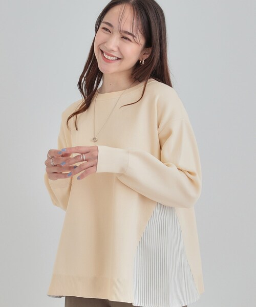 【デザイン】きれい見えカジュアルのフェイクレイヤードニットに新型が登場。軽くて着やすく一日中快適に過ごせます。身体のラインを拾いにくいAラインシルエット。横姿もきれい見えに。シンプルながらも一枚着るだけでこなれ見えが叶います。【スタイリング】Aラインシルエットを活かしたボトム合わせがおすすめ。パンツならテーパード合わせがバランス良くすっきり見えに。ワイドパンツ合わせなら大人っぽいリラックスしたスタイルに。レイヤード風のデザインなのでインせずにさっとコーデが決まり、忙しい日のスタイリング選びにもおすすめです。ワイドシルエットのデニムと合わせると、ゆるっとした中にも清潔感あるコーデが完成。スカートならナローシルエットのものを合わせるのがおすすめです。【素材】本体のニット部分は軽さが特徴。膨らみのある風合いやモチっとした弾力性が、まるでスポンジのような生地感が特徴の糸で編み立てています。※照明の関係により、実際よりも色味が違って見える場合があります。また、パソコン・スマートフォンなどの環境により、若干製品と画像のカラーが異なる場合もございます。モデル情報:身長163cm B81 W59 H88 着用サイズ:02(M)店舗へのお問い合わせ商品番号:C62-15015●製品寸法:01(S):着丈61cm B98cm 袖丈49cm 肩幅49cm02(M):着丈63cm B102cm 袖丈50cm 肩幅50cm03(L):着丈65cm B106cm 袖丈51cm 肩幅51cm04(LL):着丈66cm B108cm 袖丈52cm 肩幅52cm備考: