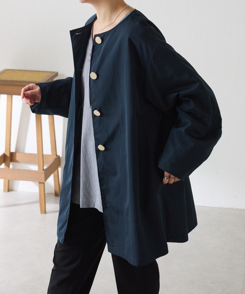 羽織りやすさと上品見えが叶うノーカラーコート【POINT】・ヴィンテージの加工によるシワっぽい生地がカジュアルすぎない印象になります。・微光沢の生地やメタルボタン、すっきり見えするノーカラーできれい見えするのでセレモニーにもぴったりです。・気軽に羽織りやすく、防寒性もあるミドル丈は、自転車移動が多い方や小柄さんにもおすすめです。・裏地はストライプにすることで開けて着たときにチラっと覗くのがおしゃれです◎・袖口はリブで上から生地を被せ、リブは見えない仕様になっています。風を防いでくれて気温が変わりやすい季節の嬉しいポイントです◎【おすすめコーディネート】軽く、ジャケットも隠れる丈感なのでセレモニーの際にもおすすめです◎【おすすめのスタイリングアイテム】・楊柳ドットジャガードボウタイブラウス CLZ1061204A0001・ジャージテーパードパンツ CLZ1061202A0001・アレンジオーバーシャツ CLZ1061204A0003・リラックススーパーワイドデニム CLZ5042203A0001【素材】《表地》本体:ポリエステル74%, ナイロン26%リブ部分:ポリエステル98%, ポリウレタン2%《裏地》ポリエステル100%透け感:なし裏地:あり伸縮性:なし光沢感:なしおすすめ着用時期:秋、春洗濯:手洗い可≪返品・交換について≫・着用後、洗濯後の返品・交換は致しかねます。・商品到着後、着用前に商品状態のご確認をお願い致します。・ECサイトでご購入いただいた商品は、お修理を承っておりません。【気になる商品は「お気に入り」登録を】ハートマークをクリックし、お好きなカラーを選んでお気に入りに登録すると入荷情報や残り1点の通知、完売カラーの再入荷、セール情報などを受け取ることができます。※撮影場所やお使いのモニター環境により若干お色味が異なる場合がございます。特にロケの撮影では明るく見える傾向にございます。詳細撮影画像で色味をお確かめくださいます様お願いいたします。※サンプルで撮影をしております。若干の仕様が変更になる場合がございますので予めご了承の上ご注文くださいますようお願いいたします。※サンプルでの採寸のためあくまで目安となります。予めご了承ください。