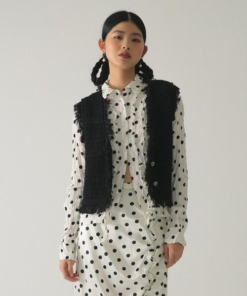 表情豊かな編地が映える主役ベスト■デザイン2種類の糸を組み合わせ、ツイード生地のような表情を再現したニットベスト。各所に施されたフリンジデザインが、着こなしに程よいカジュアル感をプラスします。編地の表面には立体感と奥行きがあり、1枚で華やかな印象を演出。首元はすっきりとしたVネックで、様々なインナーとの重ね着を楽しめる1着です。■コーディネートシャツやカットソーの上からさらりと羽織るのがおすすめ。春らしい素材感のため、季節の変わり目から軽やかなレイヤードスタイルを楽しめます。ミックス感のある風合いは、デニムからきれいめなスラックスまで幅広いボトムスと好相性。■サイズ程よくゆとりを持たせた、リラックス感のあるシルエット。体のラインを拾いにくく、レイヤードしてももたつかない絶妙なサイズ設定です。■素材テープヤーンとストレート糸を組み合わせた、こだわりのツイード調編地。何度も調整を重ねて実現した柔らかさと、春先に適した軽やかな質感が魅力です。■ケア方法手洗い可 (詳細は商品についている品質表示ラベルをご覧ください)Model:H175 B78 W59 H89 Size:ONE SIZE※光の当たり具合やパソコンなどの閲覧環境によって、実際の色味と異なって見える場合がございます。予めご了承ください。※商品の色味は商品単体で撮影した画像をご参照ください。