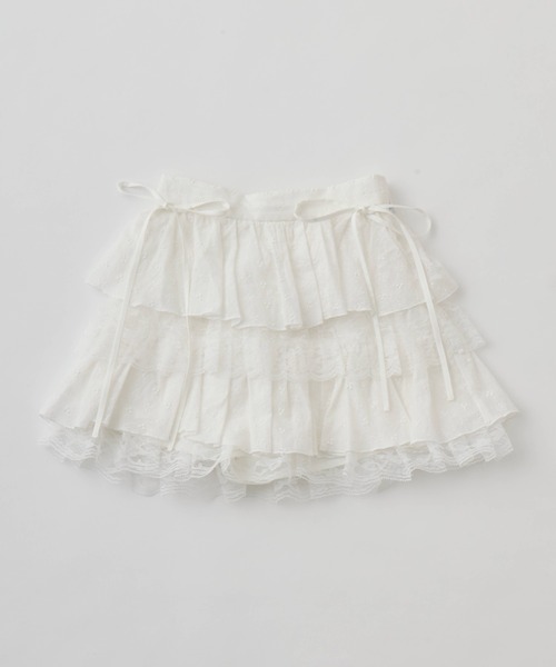 ふわふわのボリューム感がかわいいティアードスカートご好評につき新色が追加で再登場!■デザイン・リボンとレース入りのティアードシルエットで、女の子らしい着こなしが叶うガーリーデザイン。・程よく広がるシルエットで、細見え効果も抜群です。・ホワイトは細かいスタッズが付いていて、シンプルすぎず華やかな印象になります。・背中側がゴムになっていて着心地らくちんで、裏地はパンツなので安心感も◎■カラー・オフ/ホワイト(細かいスタッズ)/ホワイト系(綿レース)/ブラック/チャコールの5色展開■スタイリング・ダブルジップのトップスからちらっと見えるよう合わせると今っぽい着こなしに。・ニットやブラウスを合わせると、ガーリーな雰囲気にまとまります。・足元はロングブーツやローファー合わせで、甘さを引き締めるのがおすすめ。-----------------------------裏地:あり光沢感:なし透け感:レース部分あり伸縮性:なし-----------------------------model:164cm※着用、お取り扱いの際は、商品についている品質表示とアテンションタグを必ずご確認下さい。※ご覧のモニター環境や撮影環境により実際の商品と多少色味が異なって見える場合がございます。ご理解の程よろしくお願いいたします。※引っかけ注意・粗い組織のものや、表面に凹凸があってルーズな組織のもの表面に糸が浮き出ているものは、ちょっとした不注意から引っかけてしまいがちです。取り扱いの際は取り扱い絵表示確認の上、十分注意してください。・着用時にベルトや、バックや周囲の壁など表面の粗いものとの摩擦や引っかかりに注意してください。・水洗いやクリーニングの際にも他の物ものとの引っかかりに注意して下さい。■お気に入り登録のおすすめ【気になるアイテムを登録】ハートをクリックしてお気に入りに登録すると完売カラーの再入荷やラスト1点の通知、セールの通知を受けとることができます。【ブランドを登録】新商品や再入荷、セール通知など、いち早くブランドの情報を受けとることができます。