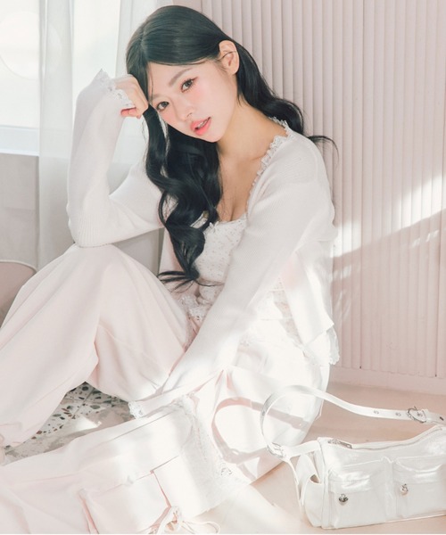 大人っぽさと甘さを両立させたカーディガン■デザイン・衿元やフレアに広がる袖口のレースで、どこから見ても抜かりなくかわいいデザイン。・Vネックなので首元すっきり着れて、デコルテラインをきれいに見せてくれます。・短めの丈感でバランスが取りやすく、程よく身体にフィットするリブ素材で華奢見せを叶えてくれます。・羽織りとしても、前を閉じてトップス風としても着られる万能カーデです。■カラー・オフ/ピンク/サックス/ブラックの4色展開■スタイリング・ミニスカートを合わせてとことんガーリーにまとめるのがおすすめ。・デニムパンツなどカジュアルアイテムとの相性も◎・インナーは見えてもかわいいレースやフリル付きのデザインがおすすめ。-----------------------------裏地:なし光沢感:なし透け感:なし伸縮性:あり手洗い:可能タンブラー乾燥:不可アイロン:不可-----------------------------※着用、お取り扱いの際は、商品についている品質表示とアテンションタグを必ずご確認下さい。※ご覧のモニター環境や撮影環境により実際の商品と多少色味が異なって見える場合がございます。ご理解の程よろしくお願いいたします。※引っかけ注意・粗い組織のものや、表面に凹凸があってルーズな組織のもの表面に糸が浮き出ているものは、ちょっとした不注意から引っかけてしまいがちです。取り扱いの際は取り扱い絵表示確認の上、十分注意してください。・着用時にベルトや、バックや周囲の壁など表面の粗いものとの摩擦や引っかかりに注意してください。・水洗いやクリーニングの際にも他の物ものとの引っかかりに注意して下さい。■お気に入り登録のおすすめ【気になるアイテムを登録】ハートをクリックしてお気に入りに登録すると完売カラーの再入荷やラスト1点の通知、セールの通知を受けとることができます。【ブランドを登録】新商品や再入荷、セール通知など、いち早くブランドの情報を受けとることができます。