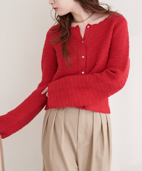 【2026SS natural couture】スカラップカーディガン■Design さりげない甘さが香るスカラップデザインが大人可愛いアイテム。首元や袖口にあしらわれたスカラップが、シンプルな中に華やかさを添え、コーディネートの主役として活躍します。コンパクトなシルエットなので、スタイルアップ効果も期待できます。カジュアルになりすぎず、大人の女性にふさわしいリュクスな雰囲気を演出します。ボタンを留めてプルオーバーとして着たり、Tシャツやカットソーに羽織ったりと、着こなしのアレンジも自由自在。オフィススタイルにはもちろん、デニムと合わせてカジュアルに着こなすのもおすすめです。■Stylingスカートスタイルからパンツスタイルまで、幅広いコーデに合わせやすい一枚。シンプルなボトムスと合わせるだけで、洗練された着こなしが完成します。あえてメンズライクなパンツやスカートと合わせて、甘辛ミックススタイルに挑戦するのもおすすめです。足元はパンプスやブーツ、スニーカーなど、合わせるアイテムによって雰囲気が変わるので、様々なスタイリングを楽しめます。■Fabric 肌触りが良く、程よい厚みでロングシーズン着用可能。ピンクは薄めの優しい雰囲気のお色味となっております。===================お手入れ方法:手洗い伸縮性:あり裏地:なし透け感:オフホワイトあり光沢感:なし生地感 :滑らかな生地感===================※着用、お取り扱いの際は、商品に付いている品質表示とアテンションタグを必ずご確認ください。【お気に入り登録でお得な情報がいっぱい】・「商品のお気に入り登録」で再入荷通知や、ラスト1点の通知、セール通知をいち早く受け取ることができます。・「ブランドのお気に入り登録」で新商品や再入荷など、お得な情報を受け取ることができます!※店舗の入荷時期は商品によって異なります。店頭の在庫状況につきましては各店舗にてお問い合わせください。※撮影時の光の関係で、画面上の画像と実際のお色とでは若干の色差が生じる可能性がございます。また、ご覧いただいているモニター画面や、お使いのブラウザによっても、お色の違いがございますことをあらかじめご了承くださいませ。202601092026SS_natu26SS