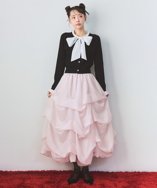 まとうだけで華やぐ、空気をはらむボリュームシルエットが魅力軽やかなシフォン素材を贅沢に使用した、タックバルーンデザインのボリュームスカート。空気を含んだようなふんわり感と立体的なドレープが動くたびに華やかな表情を生み出し、シーズンレスで楽しめるアイテムです。程よく透け感のある生地を重ねることで、軽やかさの中に上品な抜け感をプラス。ウエストはすっきりとしたデザインで、コンパクトなトップスやショート丈ニットと好相性。ざっくりニットを合わせて甘さを引き算したモードフェミニンな着こなしや、ブラウスをインして大人ガーリーにまとめるのもおすすめ。どんなコーディネートにも馴染みつつ、着るだけで主役になれる一枚です。透け感:なし裏地:あり伸縮性:なし生地の厚さ:やや薄手F:スカート丈83.5cm ウエスト63cm