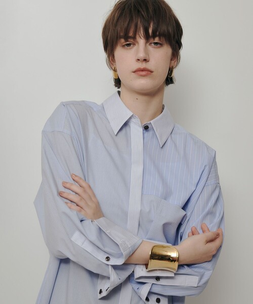 【allureville 2026 Spring & Summer】 コットンのシャツ地を3タイプ組み合わせたシャツになります。オーバーサイズのドロップショルダーになり、ドルマンスリーブ要素のパターンにしているのでマニッシュな雰囲気の中に女性らしさのある雰囲気に仕上げています。胸のパッチポケットがアクセントになっています。こちらのシャツはデニムやチノ素材のボトムに合わせて着ていただくのがおすすめです ※照明の関係により、実際よりも色味が違って見える場合がございます。 またパソコン・スマートフォンなどの環境により、製品と画像のカラーが異なる場合もございます。 予めご了承ください。