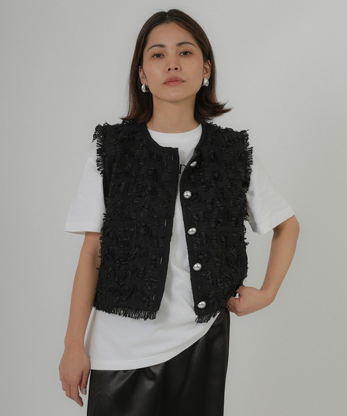 【Floran ツイードベスト】\いつもの服に重ねるだけ/きれいめが苦手じゃなくなるツイードベスト■Styling表情のあるツイード素材と、洗練されたコンパクトバランスが魅力のツイードベストが登場しました。フリンジディテールと存在感あるシルバーボタンがシンプルな装いにさりげない華やかさを添えます。きちんと感のある見た目ながら、かっちりしすぎないデザインで普段カジュアル派の方でも取り入れやすい一枚。Tシャツやカットソーに重ねるだけでコーデ全体をぐっと格上げしてくれます。コンパクトな丈感と程よくゆとりのある身幅で、身体のラインを拾いにくく自然にスタイルアップが叶うのもポイント◎前開き仕様なのでレイヤード次第で印象を変えて楽しめます。ロゴTや無地Tに合わせてカジュアルを大人仕様に◎シアートップスやブラウスをインして女性らしいきれいめスタイルもオススメ。ワイドパンツやスラックスと合わせれば綺麗な縦ラインを叶えてくれます。ブラウス+スラックスでセレモニースタイルにも対応。デニム合わせでもラフになりすぎずこなれた印象に◎普段使いはもちろん、オケージョンにも頼れる一枚。一着あるとシーンを選ばず活躍するツイードベストです。こんな方におすすめTシャツやカットソーコーデが多くマンネリしがちな方。きれいめアイテムに挑戦したいけど甘すぎるのは苦手な方。体型カバーしつつ、さりげなくおしゃれにみせたい方。ベストに興味はあるけどどう合わせればいいか悩んでる方。セレモニーやきちんとした場にも着られるアイテムを探している方。いつもの服に足すだけで印象を変えたい方にオススメです。■Detail立体感のあるツイード素材で高見えしてくれます。存在感のあるシルバーボタンがアクセントになりおしゃれ感倍増◎前開きデザインで着脱しやすく着回し力抜群。アームホールはゆとりがあり、重ね着してももたつきません。コンパクトな着丈で、低身長さんもバランスが取りやすい。身幅に程よいゆとりがあり身体のらいんを拾いにくい。インナー次第でボリューム調整ができ幅広い体型に対応。重ね着しても着ぶくれしにくく、自然にスタイルアップが叶います。■Material軽さがありながら程良いハリ感と安定感のある素材。裏地付きでインナーの滑りもよくロングシーズン快適に着用できます。▽生地感透け感:あり 〇〇〇〇●なし生地の厚さ:厚い 〇〇●〇〇 薄い裏地:あり伸縮性:なし※この素材は摩擦(特に湿った状態での摩擦)や、汗や雨などでぬれた時は他の衣料や下着・バッグなどに色が移る場合がありますので、ご注意下さい。※繊細な素材を使用している為、引っ掛かりには十分お気をつけください。※洗濯の際は、他の物と一緒に洗わないでください。※濡れた状態で他の洗濯物を重ね合わさないでください。※漂白剤および漂白剤入りの洗剤のご使用はお避け下さい。※水洗いやクリーニングの際は、クリーニングネットを使用ください。また、つけおき洗いはお避けください。※商品の梱包には細心の注意を払っていますが、通販の特性上、到着時に畳みシワがついている可能性がございます。予めご了承ください。※詳しいお手入れ方法は商品タグをご参照ください。※この商品は、糸及び編組織の性質上、引っかけ・引っかかりやすい性質をもっております。着脱時には十分ご注意下さい。【Information】◆《お気に入り登録》がオススメ◆・「商品のお気に入り登録」で再入荷通知や、ラストの通知、セール通知も受け取ることが出来ます。・「ブランドのお気に入り登録」で新商品や再入荷など、お得な情報を受け取ることが出来ます※撮影時のライティング、太陽光、ご覧になっているモニター・PC環境により、実際の商品と色味が異なって見える場合がございます。予めご了承をお願い致します。