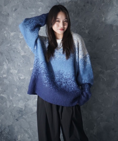Gradient Animal Shaggy Knit / グラデーション 総柄 プルオーバー クルーネック シャギーニット ファブリック ジャガード織りで柄を表現した厚みのあるニット素材。 しっかり起毛させているので保温性が高く、見た目も温かみのある仕上がりです。 コーディネイト 秋や春は一枚で、冬はインナーとして着用できるポロニットや総柄ニット。 インにタンクトップやストライプシャツ、オンブレチェックシャツをレイヤードするのもおススメです。 ボトムスはタックパンツできれいめに、カーブパンツやバルーンパンツ、カーゴパンツやバギーパンツとも相性良くカジュアルにも着こなせます。 セットアップのインナーとしても。 メンズ、レディース共に着用できるユニセックスな仕上がりなのでペアコーデもおすすめです