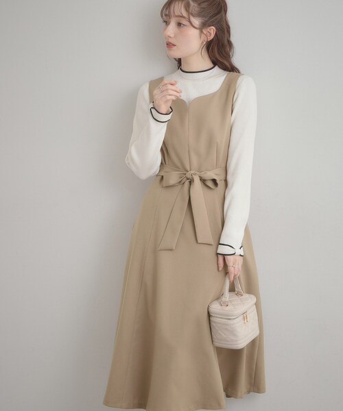 ハートネックの衿元ラインが可愛い、フィット&フレアーシルエットのジャンスカ ~POINT~ 共生地のウエストリボンがセット 両サイドポケットあり 後ウエストゴム入り 総裏仕様 CBファスナー開き 【素材】 帯電防止の糸を一部使用した表生地を使用しています。 色目によって、シャドウストライプのような縦筋が出る生地を使用しています。 【仕様】 ・ポケット数:横×2 ・後ろファスナー ・ウエスト後ろゴム ・裏地あり ※照明の関係により、実際よりも色味が違って見える場合があります。また、パソコン・スマートフォンなどの環境により、若干製品と画像のカラーが異なる場合もございます。 【スタッフコメント】 shino(164 ) ネックラインのハートのシルエットが首元をすっきり見えにしてくれます◎ ウエストのリボンは前で結ぶのはもちろん、後ろリボンにしたり取り外してシンプルに使うなどお好みの着こなしが楽しめます! 【26SS NEW ARRIVAL】 【26SS NEW COLLECTION】 モデル情報:身長163cm B81 W56 H82 着用サイズ:38(M) 店舗へのお問い合わせ商品番号:508-55016 ●製品寸法: 36(S):着丈113cm B89cm 肩幅34cm W69cm H102cm 38(M):着丈115cm B92cm 肩幅35cm W72cm H105cm 40(L):着丈118cm B95cm 肩幅36cm W75cm H108cm 42(LL):着丈119cm B98cm 肩幅37cm W78cm H111cm 備考: