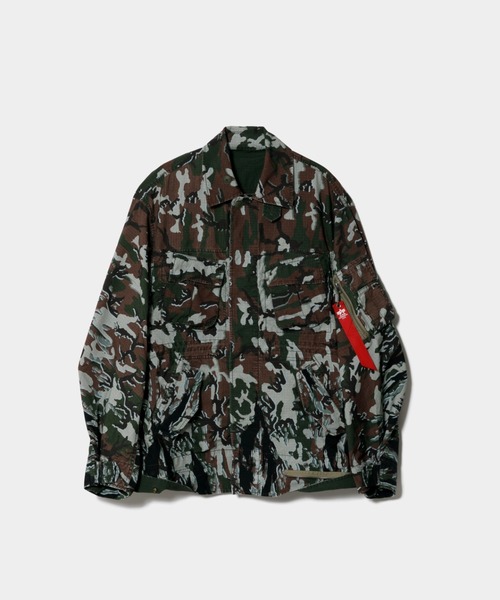 【デザインの特徴】・上下ひっくり返すことで異なるデザインが楽しめる4wayミリタリー ジャケット・WOODLAND CAMOプリントのU.S ARMY JUNGLE FATIGUE JACKET ・TIGER CAMOプリントのM-65 FIELD JACKETに変化・さらに裏返すとoliveカラーのM-65 FIELD JACKET・上下反転してECWCS COLD WHETHER JACKETにも変化・ウエストのドローコードでシルエットの変化が可能・ボリュームフィット、腰下丈【素材のこだわり】・コットンリップストップ・カモフラージュと無地との両面プリント素材・ミリタリーの代表的なカモフラージュ2柄のMIXをグラデーションで表現・WOODLAND CAMOからTIGER CAMOへと変化するユニークなプリント・アイテムのパターンとリンクした斜めに変化する柄域が特徴・ストーンウォッシュ加工