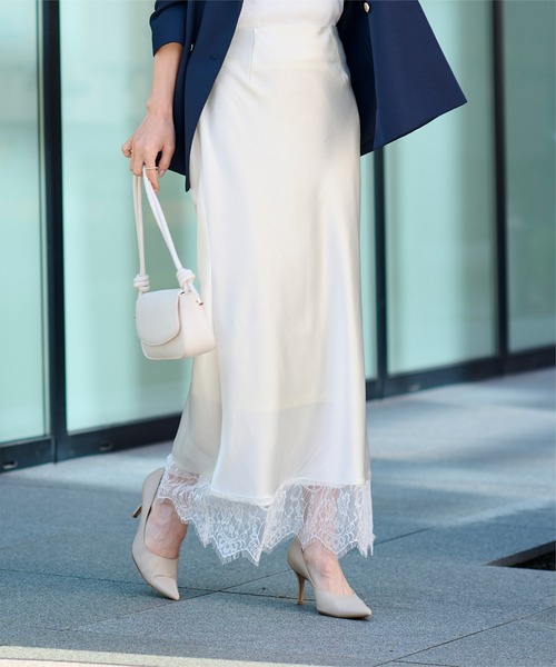 裾のレースが上品で女性らしい印象を添えるマーメイドスカート。 サテンの落ち感と滑らかな質感で、美しいシルエットを演出します。 ■Point ・裾レースデザイン:さりげない華やかさで、大人の女性らしさをプラス。 ・サテン素材:ほどよいツヤと滑らかさで、美しい落ち感のシルエットを実現。 ・後ろウエストゴム仕様:快適な穿き心地でデイリーにも使いやすい。 ・マーメイドライン:ヒップラインから裾にかけて美しく広がる、上品なシルエット。 ■Coordinate ・きれいめスタイル:ブラウスやニットと合わせて、オフィスやデートに◎ ・カジュアルスタイル:Tシャツやスウェットで程よく抜け感を出してデイリー使いも可能 ・レイヤード活用:ロングカーディガンやジャケットと合わせて、季節問わずスタイリング可能 「レースサテンマーメイドスカート」は、一枚でコーディネートの主役になり、華やかさと上品さを兼ね備えた万能アイテムです。 【ご購入前に必ずご確認ください】 ※商品により、色落ち・色移りがある場合がございます。 ※濃色品は、色移り等を防ぐため着用前に単独で洗うことをお勧めします。 ※濃色品は着用の際、摩擦により他の衣料や下着に色移りする可能性がありますので、淡色との組み合わせにはご注意ください。 ※この製品は素材の特性上引っ掛けが生じやすい面があります。表面の粗い物に擦ったり、バッグやベルト、先の鋭い物にひっかけますとささくれや糸が浮き易く、切れる事もあります。着用、着脱の際はベルト、バッグ、アクセサリー等の金具や突起物にご注意下さい。 ※当商品は機械による生産の過程上、どうしても"生地を織る際の糸の継ぎ目"や多少の"ほつれ"、他繊維の"混紡"、また、形やサイズや柄に多少の"誤差"が生じる場合がございます。 ※サイズは、実寸サイズを測っているため多少誤差がでる場合があります。製造工程の関係上、各採寸箇所実寸(平置き)より【約-3cm~+3cm】程度は誤差の許容範囲とさせて頂いておりますので、予めご了承くださいませ。 ※メーカーより密封状態で入庫し、検品時に再度袋詰めを行っておりますが、素材により染料等の臭いが強い場合がございます。 ※発送上の状態によって商品がシワになる場合がございます。 ※商品により色落ち・色移りがある場合がございますので、品質表示をご確認の上、お取り扱いにご注意くださいませ。 【伸縮性】ウエスト後ろ部分にあり 【透け感】淡色の裏地なし部分に多少あり ■おすすめシーン■ デイリーのお出掛けからショッピング、通勤やビジネスシーン、結婚式、披露宴、セレモニー、2次会(二次会)、1.5次会、成人式、同窓会、謝恩会、誕生日会、婚活、街コンなどのパーティーシーン、デートや女子会、誕生日会、演奏会、発表会、七五三、お宮参りなど幅広いシーンで着用できます。