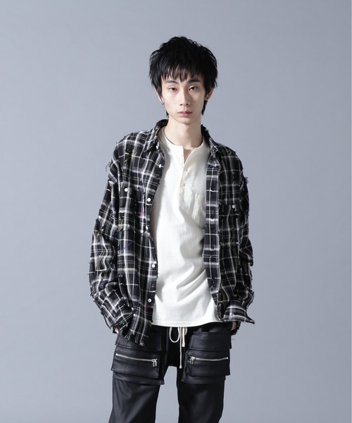 DankeSchonチェック柄をベースに、ペイント加工とダメージディテールを組み合わせたロングスリーブシャツ。ランダムに施されたペイントやクラッシュ表現がアートピースのような存在感を放ちます。程よくルーズなシルエットでシャツとしてもライトアウター感覚でも着用可能。スタイリングに一気に個性を加えてくれる一着です。POINT・チェック柄×ペイント加工のインパクトあるデザイン・随所に施されたダメージとフリンジ仕様・一枚でも羽織でも活躍する万能アイテム・コーディネートの主役になる存在感STYLE TIP・シンプルなTシャツの上から羽織ってデザインを強調・ワイドデニムやカーゴパンツと合わせてストリートライクに・モノトーンコーデに合わせて柄とペイントを引き立てるのもおすすめペイントとダメージが一点物のような雰囲気を演出する主役級シャツ。着るだけでスタイルが完成するためコーディネートに遊び心と個性を求める方に特におすすめです。DankeSchon・・・DankeSchonとは、このブランドの核となるキーワードD digitaliyデジタル式A Architect創造者N neologism新表現K kittenish悪ふざけE engrossing心を奪うの頭文字を組み合わせたものにドイツ語のSchonを付け、ブランドの意図に賛同してくれる人達に感謝の意味を込め、「DankeSchon(ありがとうの意味)」としている。