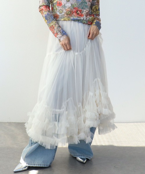 フリルが軽やかに揺れるチュールロングスカート透け感のある表情と動きのある裾デザインが、コーディネートに立体感をプラスします。ウエストはすっきりと仕上げ、甘さの中にも大人っぽさを感じるバランスに。裏地付きで安心感があり、デニムやワンピースとのレイヤードも楽しめます。カラーはやわらかな印象のホワイトと、シックに決まるブラックの2色展開です。--------------------------------------透け感:あり裏地:あり伸縮性:なしケア方法:ドライクリーニング※お洗濯の際は洗濯表示を必ずご確認ください。--------------------------------------