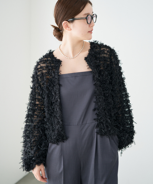 【2026SS】IENA※こちらの商品は、品番:26051900204010の追加品番です。※品番:26051900204010は既に入荷しているため、店舗に在庫がある場合がございます。※若干の仕様変更がある場合がございます。たくさんのリクエストにお応えして追加生産が決定!エアリーなチュールテープが、華やかなムードを纏えるカーディガン。繊細なチュールをテープ状にカットし、シャーリングを施したIENAオリジナルの素材を使用しています。2種類のファンシーヤーンを組み合わせることで、奥行きのある表情と特別感のある仕上がりに。華奢な肩幅設定とボクシーなシルエットで全体をコンパクトにまとめ、着膨れせず上品な印象を叶えます。シャーリングによる高い伸縮性で、見た目以上に快適な着心地も魅力。オケージョンシーンの羽織としてはもちろん、デニムやスウェットでカジュアルダウンするなど、合わせるアイテム次第で幅広く活躍する一着です。※シリーズもございます。チュールテープスカート(品番:26060900207010)※ブラックのみ下記お取り扱い表示が付きます。【色落ち】着用中の摩擦や汗、水などで濡れたことによる他のものへの色移りにご注意ください。**********************透け感:あり裏地:なし伸縮性:あり光沢感:なし生地の厚さ:普通**********************※取り扱いについては、商品についている品質表示でご確認ください。※こちらの商品は、IENAでの取り扱いになります。直接店舗へお問い合わせの際はIENA店舗へお願い致します。※照明の関係により、実際よりも色味が違って見える場合があります。またパソコン・スマートフォンなどの環境により、若干製品と画像のカラーが異なる場合もございます。予めご了承ください。※商品の色味は、商品アップ画像をご参照ください。本体:手洗い可能