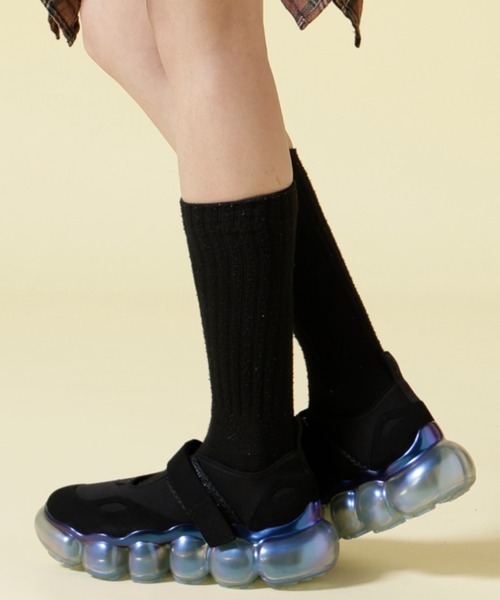 ROYAL FLASH 別注商品 こちらのMARY JANEシリーズはサイズ感がやや小さめ・細めなので、通常サイズのワンサイズアップをお勧め致します。 宝石を思わせる透明な球体で作られた厚底のクリアソールは、履いている人や見る人の意識を足元に向けさせてくれます。 今回は定番のBLACKのアッパーデザインとJEWELRYのソールのこちらのカラーの組み合わせが別注になります。 それぞれの球体は足の動きに合わせて柔らかく動くように設計されており、独特な歩き心地とグリップ感があります。また、履いた時に最適なクッション性を感じられるように素材の柔軟性をコントロールすることで、手で触った時には感じられないような、フワフワと浮いているような感覚を演出してくれます。 アッパーはウエットスーツのような生地とスエードの異素材を組み合わせたメリージェーン。 スエードを使ったストラップはマジック式テープで止める仕様となっています。 ヒール部分の高さはどのサイズも約5cm。 ボリュームがありながらも透明にすることで見た目の重さを軽減させています。 grounds / グラウンズ MIKIO SAKABEを手がけるデザイナー坂部三樹郎が監修するフットウェアブランド。 「人間と重力(地球)の関係に変化をもたらすこと」「人間と重力(地球)の接点であるアウトソールと地面を中心とした人間づくり」をテーマに、ボリュームのある特徴的なアウトソールを組み合わせたフットウェアを発表しています。 【お買いものをお楽しみいただく為に!】 ▼商品のお気に入り登録 完売カラーの再入荷通知や、ラスト1点の通知、セールの通知も受け取ることができます。 ▼ブランドのお気に入り登録 新商品や再入荷など、いち早くブランドのお得な情報を受け取ることができます。