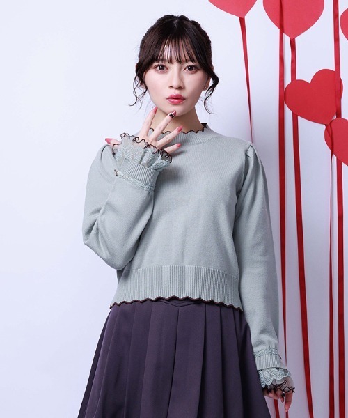 【アイテム説明】axes femme my valentine LOOK BOOK【商品紹介】わくわくするチョコレートカラーをイメージしたニットプルオーバーです。キナリはオランジェット、ピンクはいちごチョコレート、ミントはミントチョコレートの配色です。もっちりした肌触り柔らかな糸を使用しているため、着心地◎。肩タック、着丈も短めで全体的にすっきりしたシルエットがポイント。【デザイン】袖口はレース×プリーツチュールを重ねたボリュームデザイン。プリーツ端のメローと、襟ぐり・裾のスカラップを配色にし、それぞれチョコレートのイメージカラーを表現。ハートボタンもあしらい、ミルクチョコレート・ルビーチョコレート・ミントチョコレートのカラーで、マーブル感のあるエポで、湯煎され溶けて混ざったチョコレート感を表現。【コーディネート】短丈ニットなので、アウトスタイルがオススメ。ハート釦バイカラーニットカーディガンと共通の糸やボタンを使用しているため、アンサンブルのような重ね着も◎。▽ axes femme * アクシーズファム【Concept】axes femmeのお洋服であなたのライフスタイルにほんの少しだけ彩る花が咲きますように。ブランドを通して、彩る花たちが、人と人、お客様や作り手たちの想いが世界中に繋がっていきますように。ベル・エポック(フランスの古き良き時代)にパリジェンヌたちが愛したファッションや文化にルーツをおき、独自のフェミニンスタイルを楽しむブランド**********************.。.: お気に入り登録のおすすめ :.。.∇気になるアイテムを登録∇ハートをクリックしてお気に入りに登録すると完売カラーの再入荷やラスト1点の通知、セールの通知を受けとることができます。∇ブランドを登録∇新商品や再入荷、セール通知など、いち早くブランドの情報を受けとることができます。是非ご利用頂き、お買い物をお楽しみ下さい。.。.: 商品について :.。.・サイト上のカラー名と、お届け商品に記載されているカラー名が異なる場合がございます。・商品の色味は、撮影場所や光のあたり具合、お客様のお使いのPCのモニター環境などにより色味が違って見える場合がございます。予めご了承の上ご注文下さい。.。.: 返品・キャンセルについて :.。.・着用、洗濯後の返品は致かねます。・商品到着後、着用前に商品を確認して頂きますようお願い致します。