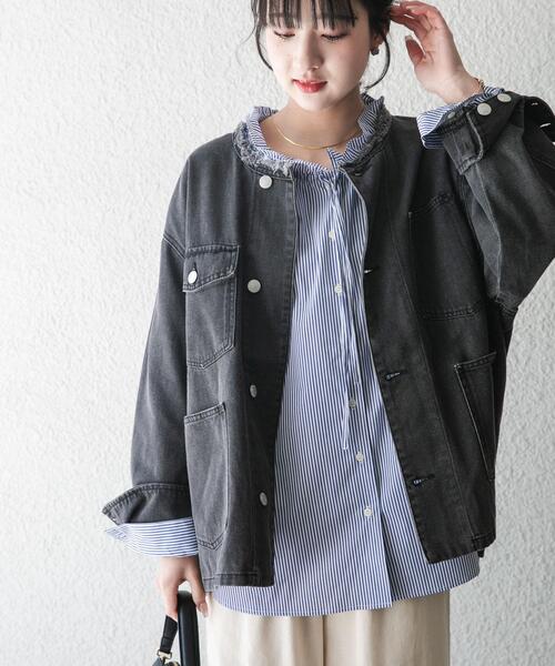 旬の抜け感を纏う、デニムオーバーノーカラージャケット 首元をすっきりと見せるノーカラーデザインで、どんなインナーとも合わせやすく、襟元がもたつかないのが魅力。幅広いレイヤードスタイルを楽しめます。襟元にはフリンジ加工を施し、さりげないヴィンテージ感をプラス。カジュアルながらも、こなれた印象に仕上げました。身体を包み込むような、ゆったりとしたオーバーサイズシルエットを採用。肩のラインを落としたドロップショルダーと広めの身幅により、厚手のスウェットやニットの上からもストレスなく羽織れます。春の主役アウターとして、デイリーに活躍するデニムジャケットです。 【2026 Spring/Summer】【26SS】 ※この商品はデニム素材を使用しています。摩擦(特に湿った状態での摩擦)や、汗、雨などで濡れると、他の衣料や下着(特に白物)に色移りする場合がありますのでご注意ください。 ※洗濯の時多少色落ちすることがありますので、出来るだけ単品洗いをおすすめします。 ※その他お取り扱いに関しましては、商品に付属のアテンションタグをご覧ください。 総重量 : 約570g ※商品画像は、光の当たり具合やパソコンなどの閲覧環境により、実際の色味と異なって見える場合がございます。予めご了承ください。 ※商品の色味の目安は、商品単体の画像をご参照ください。 ▼お気に入り登録のおすすめ▼ お気に入り登録された商品は、マイページにて現在の価格情報や在庫状況の確認が可能です。 お買い物リストの管理にぜひご利用ください。 素材感 透け感 : なし 伸縮性 : なし 裏地 : なし 光沢 : なし ポケット : あり FREE