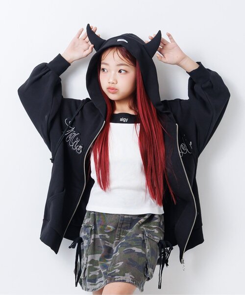 algy(アルジー)のパーカー「デビルBIGパーカー」。季節の変わり目におすすめ◎着回しも楽しめるアイテムです。【 algy ーアルジー ー 】『おしゃれを楽しみたいティーンズのリアルクローズ』着たい 欲しい トレンド・・・全部そろう小中学生向けブランドです。【取り扱い表示】40℃を上限に洗濯機で洗濯、デリケートアイテムモード、ネット使用、漂白剤を使用禁止、色物は同系の色と一緒に、洗濯後直ちに取出し、タンブル乾燥不可、日陰で吊り干し、低温でアイロン、商業ドライクリーニング不可【ご注意事項】インディゴ染め・製品染め加工この製品はインディゴ染料の使用または製品染め加工をしています。1点ごとに風合いや色の出方、サイズ等が微妙に異なる場合がございます。着用・洗濯時の摩擦や水濡れにより、色落ちをすることがございます。洗濯は単独洗いで、長時間濡れたまま放置しないようにご注意下さい。淡い色の衣類を着用の際は、十分にご注意いただき、他の製品に色移りした場合はすぐに洗濯してください。着用やお洗濯を繰り返すことにより、風合いや色の変化をお楽しみいただけます。この商品は、自然なラフ感を表現する為、断切り部分をそのまま残して企画しました。断切り部分は着用や洗濯により自然なホツレや多少のゆるみ等が生じます。糸端が出た際は、その都度ハサミで丁寧にカットして下さい。※商品により多少の誤差が生じる事がございます。あらかじめご了承下さい。※ご使用のパソコンやブラウザの環境により、実際の色とは多少異なる場合がございます。※モデル着用写真についてはイメージの為、実際の商品とカラーや仕様が異なる場合がございますので、商品画像をご覧ください。▼気になる商品をお気に入り登録ハートマークをクリックして『お気に入り登録』がオススメです!商品のお気に入り登録をすると、[再入荷][残り1点][セール情報]を受け取れます。また、『F.O.Online Store』を、お気に入り登録すると[新作アイテム][再入荷]の情報をいち早く受け取れます♪