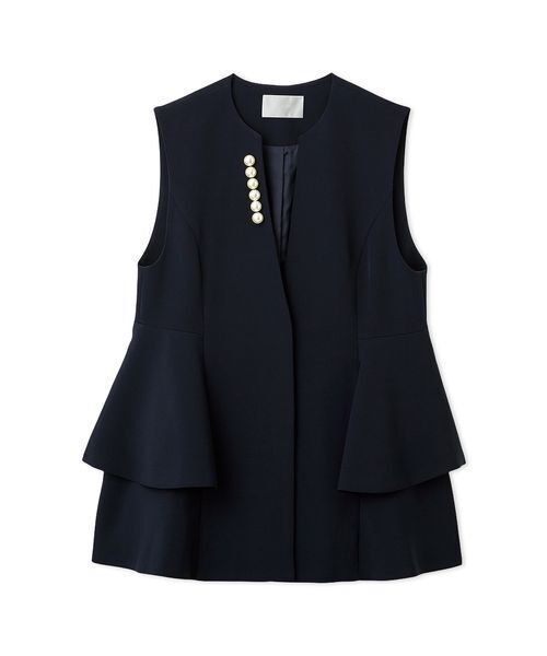 衿端にパールを施し顔周りを華やかに見せてくれます。縦の切り替えですっきりと見せつつ両脇ウエストから広がるティアードフレアーデザインが360度どこから見ても華やかで美しいシルエットに仕上げました。ブラウスを合わせてジレとしてはもちろん、ノースリーブトップスとしても着用できます。フリル下にはポケットもついていて、ご自宅で手洗い可能で実用性にも優れています。素材は適度なふくらみと柔らかさを持ち、伸縮性が程よくあるダブルクロスを使用。テーパードパンツ(CWFP261034)と同素材で【セットアップ対応】透け感:なし裏地:あり伸縮性:ややあり光沢感:なし生地の厚さ:中肉※照明の関係により、実際よりも色味が違って見える場合があります。またパソコン・スマートフォンなどの環境により、若干製品と画像のカラーが異なる場合もございます。予めご了承ください。商品の色味は、商品単品画像をご参照下さい。 ※商品画像はサンプルのため、色味やサイズ等の仕様に変更がある場合がございますので、予めご了承ください。