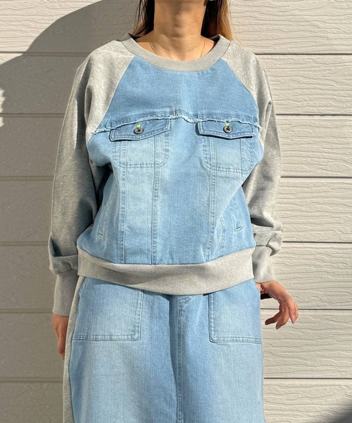 【セットアップ対応アイテム】 スウェット×デニムのドッキングトップスです。 前面と一部ディティールにデニムをドッキングさせました。 ドッキングデザインがおしゃれな一着。 後ろのヨーク部分や、ボタンホールなど所々にカラーステッチを施し遊び心をプラスしました。 フリンジのように裁ち切りにしたデニム部分がさり気ないアクセントに。 デニムは適度に色落ちさせ、ヴィンテージ感のある雰囲気に仕上げました。 同素材のスカートと合わせたセットアップとしてはもちろん、セパレートで着回していただくのもおすすめです。 同素材のスカート【ZOZO問い合わせ番号:102455397】もご用意しているのでセットアップとしてお召しいただくのもおすすめです。 ※商品の色味は、撮影場所や光のあたり具合などにより色味が違って見える場合がございます。 また、ご覧のモニター環境や撮影環境により実際の商品と多少色味が異なって見える場合がございます。 予めご了承の上ご注文下さい。 《インフォメーション》 ◆商品のお気に入り登録 完売していても再入荷時に再入荷通知を受け取ることができますので、是非ご登録ください。 ◆ブランドのお気に入り登録 新商品や再入荷などの情報を受け取ることができますので、是非ご登録ください。