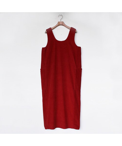 秋の装いを感じさせる、深みのある朱色が印象的なロング丈のワンピース。ワンピースといえば女性のための洋服ですが、あえて男性にも着てもらえるようなサイジングのものを選びました。インナーとして取り入れるだけで極上のレイヤードスタイルを楽しめるアイテム。そのまま着用するのはもちろん、腰回りにベルトをして着丈を調節したりなど、その着こなしの幅は未知数。男性には「ロングタンクトップ」としての解釈で、ぜひともトライしていただきたいアイテムです。生地は比較的薄手の、なおかつ若干張りのあるコーデュロイ生地を使用しています。両サイドには大きめのポケットを搭載し機能性とデザイン性をプラス。後ろ裾側に搭載された深めのスリットもアクセントとなり、シンプルながらオシャレの要素がふんだんに詰め込まれた垂涎もののアイテムです。メンズモデル身長:179cmレディースモデル身長:163cm