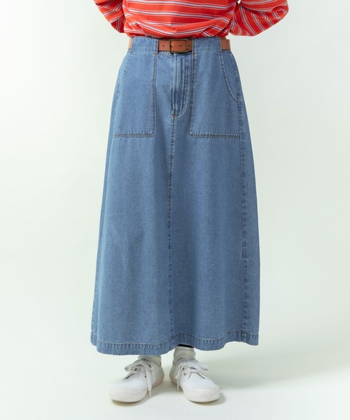 ベルトループとポケットが繋がったようなデザインが新鮮なデニムスカート。柔らかくドライタッチな肌触りのライトオンスデニム生地を使用。ブルーには着古したような風合いを出すバイオ加工を施し、ヴィンテージライクな雰囲気に仕上げました。ネイビーには洗いをかけることで、落ち着いた色味ながらも味のある風合いを表現。適度に広がる綺麗なシルエットでありつつも、さらっと軽い履き心地はライトオンスデニムならでは。さらにフロントの見え方がきちんとした印象の後ろゴム仕様で気兼ねなく楽に履いていただけます。ボーダーと合わせたマリンスタイルがはまる一着。同シリーズのジャケット(5001JK003261)と合わせたセットアップスタイルもおすすめです。オールインワン(5001PT004261)もご用意しております。※ネイビーは後日販売開始致します。--------------------透け感:なし裏地:なし伸縮性:なし光沢感:なしポケット:あり--------------------【素材の特性・お取り扱いの注意】・取り扱いの注意については取り扱い表示をよくご確認の上、着用をお願い致します。・インディゴ染料で染めています。洗えば洗う程、藍染め独特の鮮やかな色と風合いをお楽しみいただけます。・汗や雨などで濡れた場合、摩擦などにより色落ちし、他の衣料に移染することがありますのでご注意下さい。・他の衣料に色移りした場合はすぐに洗って下さい。時間が経つと取れにくくなります。・手洗いの際は必ず単独で洗濯して下さい。・綿素材の為、洗濯の際に多少縮みますので形を整えてから陰干しで自然乾燥させて下さい。乾燥機のご使用は絶対にお避け下さい。・直接日光や蛍光灯に長時間当てますと変色する可能性がありますので、保管時はご注意下さい。また、色褪せ変色は経年変化によるものですので、ご了承下さい。※撮影画像は、光の当たり具合やモニターの環境により色味が違って見える場合があります。あらかじめご了承下さい。※ブルーの画像はサンプルを着用しています。お届けする実際の商品と仕様、加工、サイズが若干異なる場合があります。サンプルの画像から前ポケットが中心に対して並行に付きます。前後のポケット端の角丸部分が角になり、すっきりとした印象になります。