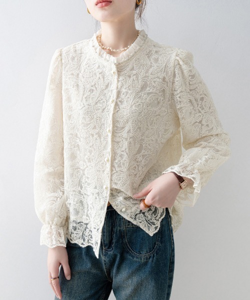繊細なレースが全体にあしらわれた、華やかさのある長袖ブラウスです。首元はフリル付きのハイネックで、顔まわりがぐっと華やぎます。袖はふんわりとしたパフスリーブで、やさしい雰囲気の仕上がりに。肩や袖口の切替もさりげなく、細かいディテールが大人っぽさを引き立てます。裾はすっきりしているので、インでもアウトでも着こなしやすいです。裏地付きだから透け感も気にせず、安心して着られます。デニムと合わせてカジュアルに、スカートでフェミニンにも楽しめる一枚です。……………………厚さ:ふつう伸縮性:なし透け感:ややあり裏地:ありポケット:なしモデル:身長160cm(着用サイズ:M)季 節:春/秋……………………★お買いものをよりお楽しみいただく為に!★◆商品のお気に入り登録お気に入りアイテムの完売カラーの再入荷通知や、ラスト1点の通知、セールの通知も受け取ることができます。◆ブランドのお気に入り登録新商品や再入荷など、クーポン配布などのお得な情報を受け取ることができます。※商品画像は撮影時の光や角度により、実物の色味と異なって見える場合がございます。※撮影はサンプル品を使用しており、表示のサイズ感も実物とは若干異なる場合もございますので、予めご了承ください。※生産時期により色・素材・サイズ感など多少異なる場合がございます。予めご了承ください。※販売商品以外のモデルが着用している商品は、モデル個人の私物となります。予めご了承ください。