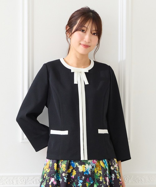 ・凹凸感としなやかな伸縮性が魅力のノーカラージャケット・伸縮性のある素材で、コンパクトなシルエットでも窮屈感のない快適な着心地に・きちんと感の中にフェミニンさを感じるデザインで、オフィスからフォーマルシーンまで幅広く活躍・立体的なリボンと配色トリミングが上品なアクセント・リボンはピンブローチになっているので取り外し可能・豊富なサイズ展開で、自分にぴったりのフィット感を選べるのも嬉しいポイント************************************透け感: なし裏 地: 裏なしポケット: あり************************************モデル身長: 166cm/ 38号着用詳細着用モデル身長 166cm / 着用サイズ 38号*取り扱いについては、商品についている品質表示でご確認ください。*撮影環境により、実際と色味が違って見える場合があります。また、PC・スマートフォンなどにより、製品と画像のカラーが異なる場合もございます。*商品画像はサンプルのため、色味やサイズ、プリント位置、仕様などに変更がある場合があります。*50号は一部の店舗・ONLINE SHOPのみの展開となります。取扱いしていないサイトもございますのでご了承ください。【RoseTiara/ローズティアラ】フェミニンな愛らしさと、大人のエレガンスを一度にまとう服。「可愛い」をずっと手放さない、あなたのためのブランドです。素材選びからデザイン、パターンまでを一貫して行い、タックの向きやギャザー分量、フリル位置などを36・38・40号と42・46・50号では調整し、パターンを分けることで美しいシルエットと着心地の良い服を提案します。