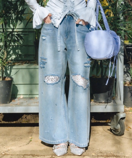 ひげ加工を施しヴィンテージライクに仕上げたデニム。全体に銃弾を打ち込んだようなホールクラッシュとダメージを加え、クラッシュ裏面にレースのあて布を叩きつけることで甘辛MIXな印象に。タックを入れて生まれたルーズなシルエットも今年らしいポイント。カラーはブラックデニムにピンクオーバーダイを重ねたBLK、定番のSAXの2色展開。透け感;なし裏地;なし伸縮性;なし光沢感;なし生地の厚さ;普通※照明の関係により、実際よりも色味が違って見える場合があります。またパソコン・スマートフォンなどの環境により、若干製品と画像のカラーが異なる場合もございます。予めご了承ください。商品の色味は、商品単品画像をご参照下さい。 ※商品画像はサンプルのため、色味やサイズ等の仕様に変更がある場合がございますので、予めご了承ください。