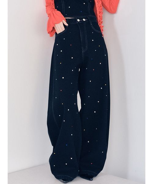 【華やかなモチーフを散りばめたルーズシルエットデニムパンツ】【Design/Styling】12オンスの程よくライトなデニム素材をベースに、少し腰にかかるルーズなシルエットで仕上げたデニムパンツ。カラーごとに異なるモチーフを全面に散りばめ、履くだけで気分が上がる華やかな一本です。ブルーにはサテンのバラモチーフとビジューを、ブラックにはハートのメタルモチーフとカラフルなビジューをあしらい、それぞれに個性をプラス。シンプルなトップスを合わせるだけでスタイリングの主役になるデザインです。【Fabric】ライトな12オンスデニムを使用し、快適な穿き心地と扱いやすさを両立。モチーフとのコントラストが際立ち、デイリーにも特別な日にも活躍する華やかな素材感です。【00サイズについて】00サイズはファッションを楽しむ小柄な女性のためにお作りしたサイズです。身長が小さめの小柄な女性にもフィットするよう、通常のFサイズや0サイズから着丈・袖丈などをリサイズし、バランス良くお召し頂けるようにお作りしております。※照明の関係により、実際よりも色味が違って見える場合があります。またパソコン・スマートフォンなどの環境により、若干製品と画像のカラーが異なる場合もございます。予めご了承ください。商品の色味は、商品単品画像をご参照下さい。※商品画像はサンプルのため、色味やサイズ等の仕様に変更がある場合がございますので、予めご了承ください。