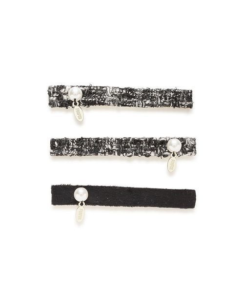 毎年大人気のツイードロゴトートバッグ(RWGB261513)と同素材のツイードを使用したヘアクリップ3本セット。ベロア1本・ツイード2本の組み合わせで、ツイード1本だけピンの向きを反対にしているため、ツイード2本を左右に添えることも、ベロアとツイードを並べて遊び心のあるスタイルにすることも可能です。ワンポイントのロゴプレートとパールでより上品に仕上げたクリップは、ヘアスタイルにさりげなく華やかさをプラスするアイテムです。※照明の関係により、実際よりも色味が違って見える場合があります。またパソコン・スマートフォンなどの環境により、若干製品と画像のカラーが異なる場合もございます。予めご了承ください。商品の色味は、商品単品画像をご参照下さい。 ※商品画像はサンプルのため、色味やサイズ等の仕様に変更がある場合がございますので、予めご了承ください。