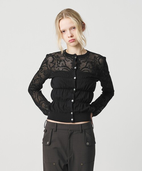 軽やかな風合いが春の訪れを感じるカーディガン ■デザイン 繊細で透け感のあるレースジャガードがエレガントな雰囲気を演出するニットカーディガン。 身頃部分にシャーリングパーツを加え、立体感のあるレディライクなデザインがポイントです。 羽織りとしてはもちろん、一枚着風でも着映えする一着。 シックなブラックと、肌なじみが良いベージュの2色をご用意しました。 ■素材 透明糸と編み合わせたレースジャガード素材を使用。 ■コーディネート ルーズシルエットのパンツとカジュアルスタイルで着こなすのがおすすめです。 同系色のボトムと合わせて、ワントーンにまとめるのも◎。 ============================ 裏地:なし 透け感:あり 光沢感:なし ケア方法:手洗い可 ============================ 【注意事項】 ※商品に「取り扱い上の注意書き」、「洗濯表示」がございます場合は、使用前に必ずご確認ください。 ※商品画像は、光の当たり具合やパソコンなどの閲覧環境により、実際の色味と異なって見える場合がございます。あらかじめご了承ください。 ※商品の色味の目安は、商品単体の画像をご参照ください。 ※画像の商品はサンプルです。 店舗へお問い合わせの際は、全国のATTISESSION各店舗まで下記の品名/品番をお申し付けください。 品名:ATT AC/C/N/E LACE JQ CGN 品番:56281000003
