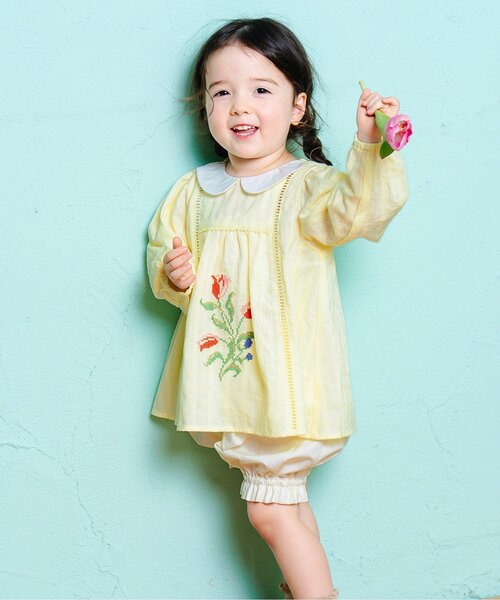 チューリップのクロスステッチと白襟が上品なミルキースーツ。トップスにはトドラーとおそろいのはしごレースを施し、ボトムは合わせやすいカラーをあわせました。春シーズンにぴったりなセットアップで、毎日のコーディネートをやさしく彩ります。【取り扱い表示】40℃を上限に洗濯機で洗濯、デリケートアイテムモード、ネット使用、漂白剤を使用禁止、色物は同系の色と一緒に、洗濯後直ちに取出し、タンブル乾燥不可、日陰で吊り干し、低温でアイロン、商業ドライクリーニング不可※商品により多少の誤差が生じる事がございます。あらかじめご了承下さい。※ご使用のパソコンやブラウザの環境により、実際の色とは多少異なる場合がございます。※モデル着用写真についてはイメージの為、実際の商品とカラーや仕様が異なる場合がございますので、商品画像をご覧ください。【 Boribon -ボリボン- 】“my little journey”小さな女の子が旅に出ました。初めて出会うきれいな景色、かわいい生きものたち。「ボリボン」は、そんなときめきの思い出をお洋服で表現します。シルエット・素材・オリジナルテキスタイルなどにこだわったアイテムを提案します。▼気になる商品をお気に入り登録ハートマークをクリックして『お気に入り登録』がオススメです!商品のお気に入り登録をすると、[再入荷][残り1点][セール情報]を受け取れます。また、『F.O.Online Store』を、お気に入り登録すると[新作アイテム][再入荷]の情報をいち早く受け取れます♪