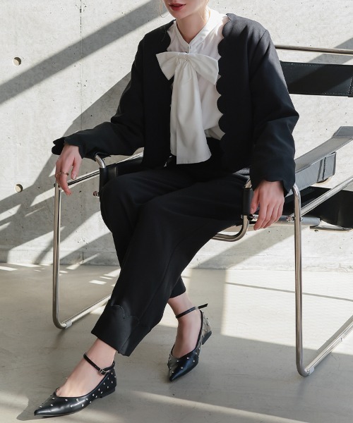 ■商品名Donobanスカラップセットアップ■サイズ(cm)【ジャケット/OneSize】身幅 約50、肩幅 約39、袖丈 約60、着丈 約49【パンツ】[ショート丈]ウエスト(ゴム) 約32-36、ヒップ 約48、わたり 約30、股上 約39、股下 約64、裾幅 約22、総丈 約100[ロング丈]ウエスト(ゴム) 約32-36、ヒップ 約48、わたり 約30、股上 約39、股下 約69、裾幅 約22、総丈 約105※平置き採寸のため若干のブレがございます。■生地感【ジャケット】透け感:なし、裏地:あり、伸縮性:なし、ポケット:なし【パンツ】透け感:なし、裏地:なし、伸縮性:あり、ポケット:2■カラーブラック、ネイビー、ベージュ■素材【ジャケット】[表地]ポリエステル 74%、レーヨン 20%、ポリウレタン 6%[裏地]ポリエステル 100%【パンツ】ポリエステル 74%、レーヨン 20%、ポリウレタン 6%■商品説明きちんと見せたい日も、いつもの日も。華やぎを添えるスカラップセットアップ。裾に波打つようなスカラップラインが上品で、女性らしさを引き立てます。しっかりとした生地感で、セレモニーシーンにもふさわしいきちんと感をキープしつつ、デイリーにも着回しできる絶妙なデザインに仕上げました。ジャケットはコンパクトな着丈でスタイルアップも叶い、ワンピースからパンツまで相性抜群。パンツはハイウエストデザインで脚長効果も。セレモニー・学校行事・お食事・お仕事シーンまで幅広く活躍します。特別な日も、日常にも、寄り添う1着です。■モデル身長詳細は商品画像をご覧ください。■ご注意■入荷時期によりお色、長さが多少異なる場合がございます。■撮影場所やイメージにより実際の商品と色味が若干異なる場合がございます。商品のお色味はカラーバリエーション画像をご参照ください。■なるべくきれいな状態で発送致しますが、製造工程上、輸送の際の汚れや擦れ等が若干見られる場合がございます。■雨、摩擦により色落ちする場合がございます。あらかじめ上記事項をご理解ご了承のうえ、お買求めくださいませ。。~*~*~*~*~*~*~*~*~*~*~*~*~*~*▼商品のお気に入り登録▼完売カラーの再入荷通知や、ラスト1点の通知、セールの通知も受け取ることができます。ぜひご登録ください♪▼ブランドのお気に入り登録▼新商品や再入荷など、ブランドのお得な情報をいち早くお知らせ!ぜひご登録ください♪
