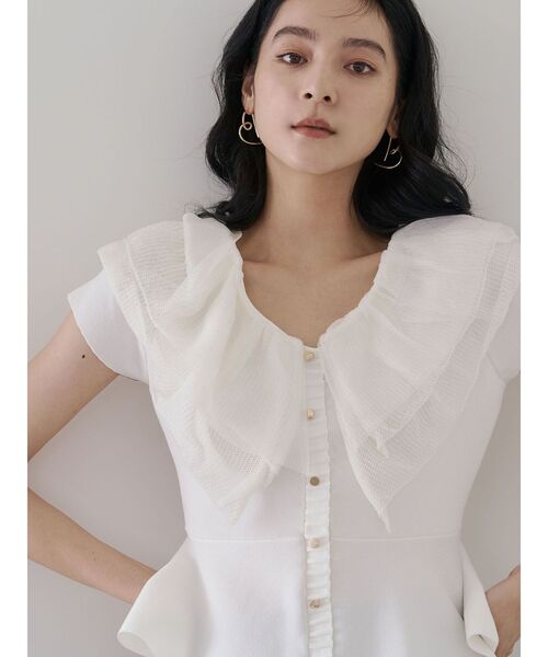 華やかフリルや凝ったディテールの特別な一枚 ■デザインコメント フリルデザインのロマンティックな雰囲気を取り入れたフリルディテールニットプルオーバー。 フェミニンになりすぎないよう、フリルの編地にメッシュ編みを採用したりと工夫を加えています。 ウエスト切り替えからフレアになっていることで腰回りをすっきり見せ、脚長効果が期待できます。 カジュアルなデニムや綺麗めなボトムにもスタイリングが出来るアイテムです。 デニムパンツと合わせ、こなれ感のあるスタイリングがおすすめです。 【修正コメント】 裾の両脇の跳ね分幅カットします。ネックラインのフリルは袖が隠れるほどにします。 ■スタイリングポイント ・テーパードの形のパンツやタイトスカートと合わせるとバランスよく着用いただけます ・スカートでオフィスカジュアルに、OFFの日はデニムパンツでカジュアルなお出かけシーンにもぴったり ・きちんと感を更に出したいときはテーラードジャケットがおすすめ --------------------------------------------------- 透け感:若干フリル部分あり 裏地:あり 生地の厚さ:普通 洗濯:手洗い可 伸縮性:なし ポケット:なし ジップ:なし -------------------------------------------------- 【 ZOZOTOWNでお買い物を楽しむ便利機能 】 ♡商品のお気に入り登録 完売カラーの再入荷時、ラスト1点の時、セール開始時にお知らせします。 予約アイテムが入荷して通常販売になった時もお知らせしてくれます! その他お得な通知も盛りだくさんです。 ♡ブランドのお気に入り登録 新商品や再入荷、セール情報など、いち早くブランドのお得な情報を受け取ることができます。 ぜひご活用ください!