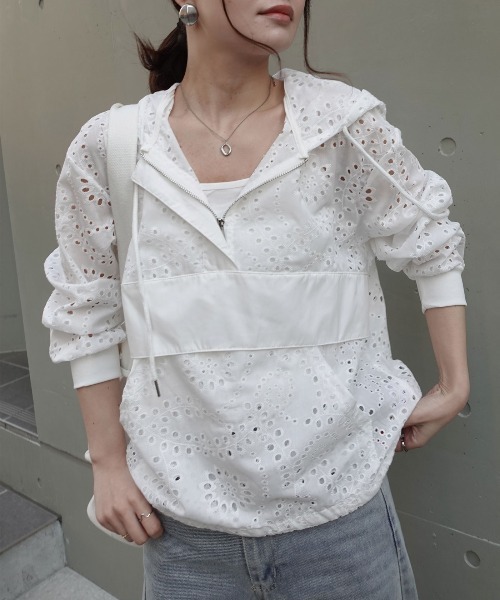 【CORNERS】美しいデザインのレースアノラックパーカーが登場!軽やかな素材で仕立てられ、カジュアルなスタイルにぴったりのアイテムです。透け感のあるレースが、日常のコーディネートに繊細さと女性らしさをプラスしてくれます。春から秋まで幅広いシーズンでご愛用いただけます。このパーカーは、ルーズフィットで体型を気にせずリラックスできる着心地も魅力です。フード付きなので、天候に合わせてアレンジもしやすく、一枚持っているだけで多様なスタイルを楽しむことができます。お気に入りのパンツやスカートと組み合わせて、おしゃれを楽しんでください。▽生地感透け感:あり 〇●〇〇〇 なし生地の厚さ:厚い 〇〇〇●〇 薄い裏地:なし伸縮性:なし◆商品のお気に入り登録【お気に入りに登録】を是非ご活用ください。 再入荷の通知や、ラスト1点の通知、セールの通知がいち早く届きます。◆ブランドのお気に入り登録新商品や再入荷など、いち早くブランドのお得情報が届きます。◆ATTENTION◆※取り扱いについては、商品についている品質表示でご確認ください。※出来る限り忠実に再現するよう務めておりますが、 ディスプレイ画面などの環境上、店頭・屋外での撮影画像は、光の当たり具合で色味が違って見える場合が あります。ご了承下さい。※こちらの商品は水や雨に濡れたり、汗による湿気、乾燥状態での摩擦により、薄い色の衣服などに 色移りする可能性がございます。予めご了承いただき、ご使用の際にはご注意くださいますようお願い致します。※平置きでの実寸のため若干の誤差が生じる場合がございます。※生産時期により若干の色ブレやサイズの変動が生じる場合がございます。※また製品加工上、お手元に届く際に匂いが生じる場合がありますが、 ご使用を続けていく事により匂いは軽減されます。※輸送時による、多少の汚れ・シワがある場合がございます。 ■海外製品の為、まれにキズや色糸混入、縫製の甘い・雑な商品、サイズにバラつきが見られる場合がございます。予めご理解の上、ご購入下さい。