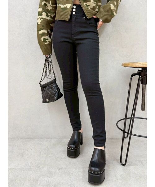 ワイドベルトデザインのスキニーデニムです。EVRIS定番のストレッチ生地を使用しておりストレスフリーに着用できます。メリハリのあるしっかりめの加工を入れており、美脚効果が抜群です。ハイウエストでコンパクトなトップスとの相性が良いです。ヒールやブーツインするスタイリングもおすすめです。