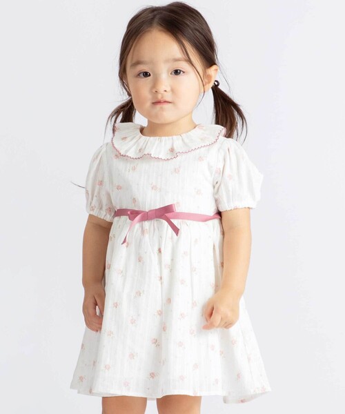 -26SS- どこか懐かしさのあるクラシカルな花柄がかわいいワンピース。 ■デザイン ボリューム感のあるフリルの襟は端にピコレースのカラーステッチが華やか。 取り外し可能なリボンベルトはお花のプリントカラーと合わせてポイントに。 丸みのあるパフスリーブと高めの位置のウエスト切り替えで女の子らしいふんわりシルエットになっています。 インナーに長袖を合わせても可愛く着ていただけるのでシーズン長く楽しめます。 オフホワイトベースに黄色いお花のイエロー系とピンクのお花のピンク系の2色展開。 ■素材/機能 太さの異なる糸を織り合わせ、レースのような軽い質感が楽しめるカラミストライプ生地を使用。 綿100%の素材なのでコーディネートの合わせ方次第で春~夏まで楽しめます。 ▼お揃い 1130-81004:ブルマ ※柄の出方は生地の裁断により一点一点異なります。 ※背中ファスナー開き。 ※ポケット無し。 ※裏地あり。 26春夏 女の子アイテム 【BeBe baby】 -ベビーにもエスプリを- BeBeのベビーラインがリニューアル。 従来の80~90cmから、アイテムによって異なる80~100cmまでのサイズ展開に変化。 ヨーロッパらしさのあるシンプルな中にもエッセンスの効いたデザインを取り入れます。 はじめましてのBeBeをよりおしゃれに楽しんでいただけるラインナップです。 【2026年春夏 シーズンテーマ】 -今日は何しよう?- トラッドでベーシックなアイテムやスタイリングに、軽やかな素材づかいやクリーンな発色とクラフト感あるディティールづかいで楽しさをプラス。 「今日は何しよう?」のわくわくした気持ちをファッションを通して表現します。 【BeBe(べべ)】 ”LOVE MODERN” 少しおませで、生意気なヨーロピアンカジュアルの提案。 時代性・流行性をとらえ、ベーシックでもワンポイントを施した遊び心、楽しさを盛り込んでいます。 シンプルだけど、こだわりのあるオリジナリティーを重視しています。