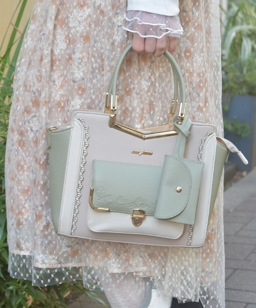 【アイテム説明】【商品紹介】華やかな配色デザインバッグです。【デザイン】濃淡の配色でメリハリをつけ、金具使いでエレガントに仕上げたアイテム。明るい色合いが春の装いにぴったりです。繊細なカットワークのスカラップや、フラップにほどこした薔薇モチーフのエンボスデザインがポイントです。小物収納に便利なミニケースが付いています。付属のベルトを使って、ショルダーバッグとしても使用できます。▽ axes femme * アクシーズファム【Concept】axes femmeのお洋服であなたのライフスタイルにほんの少しだけ彩る花が咲きますように。ブランドを通して、彩る花たちが、人と人、お客様や作り手たちの想いが世界中に繋がっていきますように。ベル・エポック(フランスの古き良き時代)にパリジェンヌたちが愛したファッションや文化にルーツをおき、独自のフェミニンスタイルを楽しむブランド**********************.。.: お気に入り登録のおすすめ :.。.∇気になるアイテムを登録∇ハートをクリックしてお気に入りに登録すると完売カラーの再入荷やラスト1点の通知、セールの通知を受けとることができます。∇ブランドを登録∇新商品や再入荷、セール通知など、いち早くブランドの情報を受けとることができます。是非ご利用頂き、お買い物をお楽しみ下さい。.。.: 商品について :.。.・サイト上のカラー名と、お届け商品に記載されているカラー名が異なる場合がございます。・商品の色味は、撮影場所や光のあたり具合、お客様のお使いのPCのモニター環境などにより色味が違って見える場合がございます。予めご了承の上ご注文下さい。.。.: 返品・キャンセルについて :.。.・着用、洗濯後の返品は致かねます。・商品到着後、着用前に商品を確認して頂きますようお願い致します。