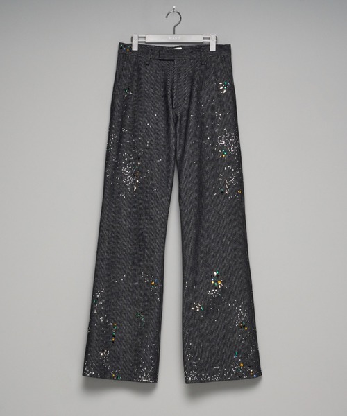デザインピケ素材のギャラクシートラウザーズ。ドライで厚みのあるピケデニムを表地に使用。裾に向かって緩やかに広がるフォルムがピケ特有の凹凸と呼応して、美しい佇まいに導く。無数のラインストーンと、色とりどりのスタッズが打ち込まれた1点物のような存在感を放つ。膝部分のラインストーンやスタッズは、まるで長い年月を経て剥がれ落ちたかのように、不自然に、あるいは必然的に欠落している。GA**XY という伏せ字のように、余白を持たせたデザイン。溢れんばかりの輝きと、ぽっかりと空いた空間のコントラストが未完成であり続ける銀河の美しさを表現。メーカー品番:M26U6PL011・透け感:なし・裏地:なし・伸縮性:なし-MASU-エム エー エス ユーは日本のメンズブランド。型の決まった服の長所と短所を考察し、その型や伝統を尊重しながら、現代の空気を纏わせることに重きを置く。コンセプトは「マス/プロダクト(MASU / PRODUCT)」で、明確な固定概念がある要素を再定義することで生まれる新しい量産品を指している。ブランド名は、日本語の敬語に使用される「~ます」に由来。日常で最も多く使用されながら価値を無くさない「ます」という言葉のように、洋服が好きな人達にとって価値が無くならないアイテムやスタイルの提案をしている。※店舗と在庫を共有しておりますので、受注確認メールが届いてもご注文のタイミングによりましては売り切れになる可能性がございますので、予めご了承ください。※商品の色味につきまして、撮影環境、お客様のお使いのPCのモニター環境により実際のカラーと画像の色味が違って見える場合が御座います。