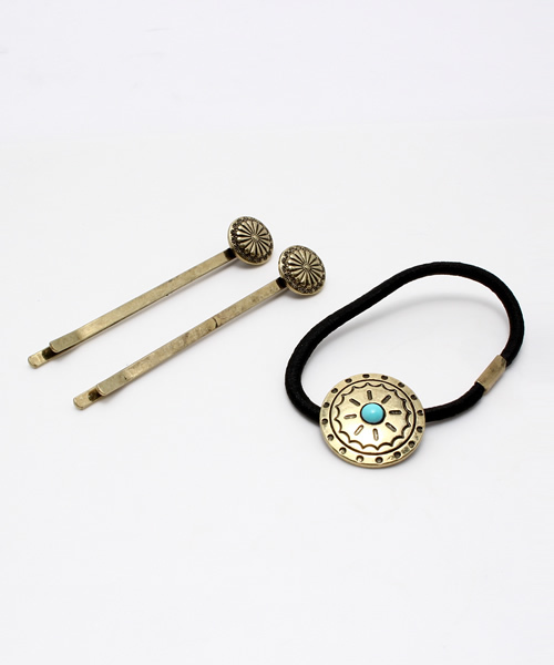 凝った彫り柄を施したコンチョをポイントにあしらったヘアゴム1点とヘアピン2本をセットにしました。イブシ感のあるシルバーカラーを採用し、味わい深いシックなイメージに落とし込みました。フォークロアテイストが注目されている今シーズンにぴったりのアイテムです。