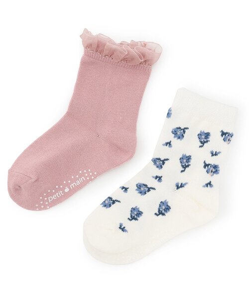 デイリーに使いやすいクルーソックスのセットです。上品な雰囲気の花柄と可愛らしいフリルデザインの2足組。かかとはしっかりとフィットする脱げにくい設計です。足裏にブランドロゴのすべり止めプリントを備えました。