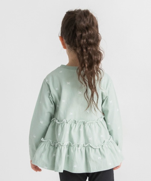 後ろ姿まで可愛い!フリルたっぷりリボン柄ティアードTシャツ■商品ポイント後ろ姿は2段のティアードフリルが主役!小さなリボンモチーフの総柄が散りばめられ、可愛らしさが溢れる一枚ですフリル部分のメロウが配色になってるのも可愛さPOINTデイリーカジュアルはもちろん、レギンスやデニムと合わせるだけで、一気におしゃれなスタイルが完成します■素材本体部分:綿100%生地を使用-----透け感:なし伸縮性:あり※モデル着用写真についてはイメージの為、実際の 商品とカラー や仕様が異なる場合がございますので、 商品画像をご覧ください。※商品の色味につきまして、お客様のお使いのPCの モニター環境により実際のカラーと画像の色味が 違って見える場合が御座います。 予めご了承の上、ご注文下さい。※店頭・外での撮影画像は光の加減で、 実際の商品より明るく見える場合が御座います。