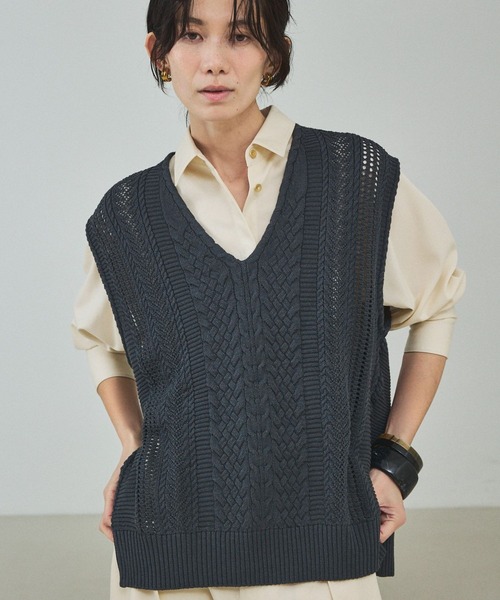 *Detail*ドライタッチで、ほどよくムラ感のあるリネン混糸を使用したニットベスト。透かし柄を効かせたミックスケーブルが、軽やかで奥行きのある表情を演出します。レイヤードしやすいVネックで、ロングシーズン活躍する一枚です。*Coordinate*シアーTやシャツに重ねれば、抜け感のある大人カジュアルが完成。初夏にはノースリーブプルオーバーとして、一枚着もおすすめです。ワイドパンツやテーパードパンツと合わせて、都会的なリラックススタイルに仕上がります。【商品のお気に入り登録】完売カラーの再入荷通知や、ラスト1点の通知、プライスダウンしたセール通知も受け取ることができます。【ブランドのお気に入り登録】新作や再入荷等、いち早くブランドのお得な情報を受け取ることができます。