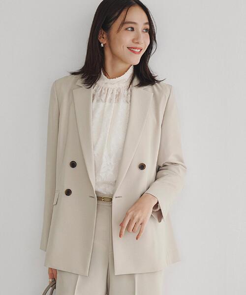 【デザイン】定番人気シリーズのダブルブレストジャケットが今年も登場!今年は衿の形をピークドラペルからテーラードカラーに変更し、より着やすいデザインにしています。ブラウンとネイビーの新色が追加されています。接触冷感・UVカットの機能付きで、ご自宅で手洗い可能です。【素材感】ウールの長所とポリエステルの長所を融合したハイブリットな糸(トリクシオン)を使用した梳毛調合繊。ウォータージェットという織り機で糸を織る段階で水を使い、従来のものよりも膨らみが出る機械を使用しております。スーツ地っぽいのにジャージのような着心地とキックバックの良いストレッチ性と反撥性が特徴です。更に仕上げに特殊な加工を施し、マスクメロンのような表情の細かいシワと少し天日干し調のナチュラルなシワをミックスして仕上げております。綺麗めなのにかっちりしすぎない、でもカジュアルすぎない少しリラックス感もある新感覚の素材となっております。【着こなしポイント】同素材のワイドパンツ(商品番号:153-61035)とのセットアップでの着用がおすすめです。裏地をあえて付けずに、シーズン長く着用いただけるようにしています。とても軽い着心地なのでセットアップでオフィススタイルにも、デニムなどでオフの日にも使えるジャケットです。【仕様】・ポケット数:横×2・裏地なし※この製品は、太陽光線中の紫外線(UV)を通しにくくします。この効果は永久的ではありません。※こちらの商品は複数の国で生産しております。日本製ベトナム製原産国のご指定はできかねますので、予めご了承の上、ご注文いただきますようお願いいたします。※照明の関係により、実際よりも色味が違って見える場合があります。また、パソコン・スマートフォンなどの環境により、若干製品と画像のカラーが異なる場合もございます。モデル情報:身長163cm B80 W59 H82 着用サイズ:02(M)店舗へのお問い合わせ商品番号:153-41035●製品寸法:00(XS):着丈64cm B89cm 袖丈56cm 肩幅38cm01(S):着丈66cm B92cm 袖丈58cm 肩幅39cm02(M):着丈67cm B96cm 袖丈59cm 肩幅40cm03(L):着丈68cm B99cm 袖丈60cm 肩幅40cm04(2LT):着丈69cm B102cm 袖丈61cm 肩幅41cm42(2L):着丈69cm B106cm 袖丈58cm 肩幅43cm44(3L):着丈70cm B110cm 袖丈59cm 肩幅43cm46(4L):着丈71cm B114cm 袖丈59cm 肩幅44cm48(5L):着丈72cm B118cm 袖丈60cm 肩幅44cm50(6L):着丈73cm B122cm 袖丈60cm 肩幅45cm備考:重量:約320g(サンプルサイズ)