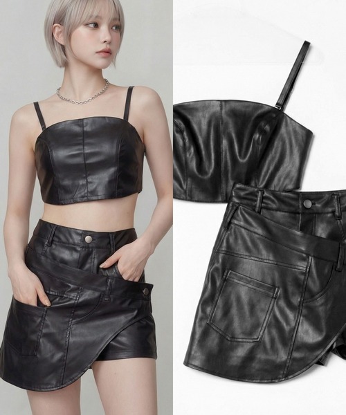 同生地のビスチェが付属する合皮ショーツ。ラップスカート風に巻き付けて着脱可能なパーツで、アシンメトリーなミニスカート見え&シンプルパンツと2WAYに着回し可能なマルチボトムです。コンパクトでタイトめなサイズ感に加え、ハイウエスト×ミニ丈で脚長&美脚見えしてスタイルアップ効果抜群◎セットアップコーデはもちろん、それぞれ単体でも使い回せるマルチで便利な優秀アイテム2点セットです。背中シャーリングで伸縮性のあるビスチェは、ショルダーストラップの長さが調整可&着脱可で、どんなトップスともレイヤードしやすい仕様です。▼コーデアイテム・ベルテッドチャンキーヒール サンダル/オープントゥパンプス(検索:98748782)・オフショルマルチチェックシャツ(検索:99217157)・ビスチェ+クロップドニットマルチトップ(検索:101446961)
