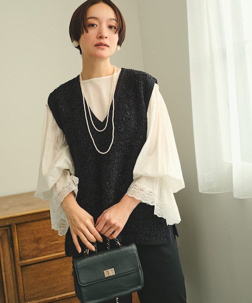 PUAL CE CIN2026 SPRINGAnniversary THE SPECIAL DAYby PUAL CE CIN◇綺麗見えと楽チン着心地が両立!クラシカルなツイード見えニットベスト◇●デザインツイード見えするデザインでありながら、ニット素材なのでラフに着用することが出来るニットベスト。ヒップに掛かる絶妙な着丈は様々なボトムスとのバランスがとりやすく、Vネックで顔周りをすっきりとさせつつ、身幅を広くとったゆったりとしたシルエットなので、さまざまなアイテムとのレイヤードが楽しめ、着方のアレンジがしやすい1着です。リブ部分が程よくラフな雰囲気を加えてくれるので、日常にも特別なシーンにも活躍する一枚です。カラーは定番のアイボリー/ネイビーに加え華やかさが増すブラックとアイボリーの糸を組み合わせたミックス調カラーも登場。様々な糸を織り込んだツイードライクニットは表面に奥行きを感じられ、クラシカルな雰囲気を演出。さらりとした肌触りのニットなのでロングシーズンに渡り着方のアレンジがしやすいのも嬉しいポイント。オンでもオフでも使える応用力が高いカーディガンです。●スタイリングオンでもオフでも使える応用力が高いニットベスト。セレモニーシーンにはボトムスにはスラックスを合わせてインにはボウタイやレースブラウスを合わせてレディなスタイリングやシンプルなシャツやカットソーを合わせてマニッシュな着こなしにも昇華できます。ベストなので、寒い時はジャケットを羽織ることも可能。ボトムスを変更すればカジュアルな着こなしにもマッチ◎カジュアルな着こなしにはデニムやカーゴパンツを合わせINにはボーダーやプリントTシャツとスタイリング。シャツワンピースの上にレイヤードするスタイリングもおすすめです。華やかなツイード調ニットはアクセやメイクを盛らずとも、一気に洒落感をUPしてくれます。●素材アクリル混の柔らかさのある素材でかちっとしすぎない印象。===============================洗濯方法:手洗い/ドライクリーニング/ウェットクリーニング もみ洗いは避け、押し洗いをしてください。/毛製品を洗える中性洗剤をご使用ください。透け感:なし裏地:なし伸縮性:あり光沢感:なし生地の厚さ:普通【スタッフコメント】年齢:30代半ば/身長:155cm/普段着用サイズ:M~Lサイズサイズ感:ゆとりがありラフな着心地。窮屈感は無く、ヒップを覆う着丈でした。素材感:伸縮性もあり、肌当たりが柔らかいアクリル混のニット素材です。===============================※撮影場所やお使いのモニター環境により若干お色味が異なる場合がございます。特にロケの撮影では明るく見える傾向にございます。※予約商品はサンプルで撮影をしております。若干の仕様が変更になる場合がございますので予めご了承の上ご注文くださいますようお願いいたします 。※着用、お取り扱いの際は、商品についている品質表示とアテンションタグを必ずご確認下さい。【予約品の入荷時期について】店舗入荷時期と予約商品のお届け時期が異なる場合がございますので、予めご了承ください。---------------------------------------------------------------【お買い物をよりお楽しみいただくために】気になるアイテムの『♡お気に入り登録』登録した商品の「残りわずか」「再入荷」「値下げ」などの情報や、クーポンなどのお知らせを受け取ることができます!PALCLOSETアプリのブランドフォロー新商品や最新ニュースのUP、イベントなどのお得な情報のお知らせが届き、いち早くチェックすることができます!セレモニー/セレモニースタイルオケージョン/オケージョンスタイル卒業式/卒園式/入学式/入園式学校行事/参観日/七五三/753/お宮参り演奏会/発表会/同窓会/謝恩会/二次会