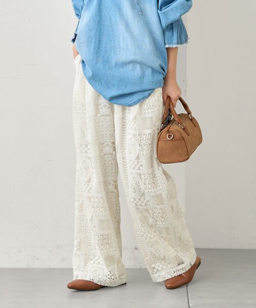 大きめのデザインレースにウエストゴムで楽してお洒落!選べる3サイズ展開が嬉しいイージーパンツ◎■デザインパッチワークのように切り替えた大判のボタニカル柄が目を惹く、存在感たっぷりのレースパンツ。繊細なレース素材に大胆な柄を落とし込むことで、甘くなりすぎず大人も取り入れやすい一本に仕上げています。シンプルなトップスと合わせるだけで、コーディネートに季節感と華やかさをプラスしてくれるアイテムです。ウエストは総ゴム仕様で、内側の紐でフィット感の調整が可能。締め付け感が少なく、リラックスして着用できるのも嬉しいポイントです。シルエットはすとんと落ちるワイドストレートで、脚のラインを拾いにくく、自然に体型をカバーします。裏地付きのため、レース素材でもインナーの透けを気にせず安心して着られます。サイズはS・M・Lの3サイズ展開。身長や体型、好みの着丈に合わせて選べるため、デイリーからお出かけまで幅広いシーンで活躍します。動くたびに表情が変わるレースの質感が、いつものスタイルをさりげなく格上げしてくれる一着です。■スタイリング無地のTシャツやシンプルなシャツと合わせるだけで、柄が主役のコーディネートが完成します。トップスをインするとウエストまわりがすっきり見え、スタイルアップ効果も期待できます。足元はサンダルで抜け感を出すと夏らしく、スニーカーを合わせればカジュアルダウンも可能です。短丈トップスやベストと合わせると、バランス良く今っぽい印象に仕上がります。■お手入れ方法洗濯:液温は40 ℃を限度とし、手洗いができるアイロン:底面温度120 ℃を限度としてアイロン仕上げができるタンブル乾燥:不可・・・・・・・・・・・・・・・・・・・・・・透け感:なし裏地:あり伸縮性:なし光沢感:なし生地の厚さ:普通・・・・・・・・・・・・・・・・・・・・・・▼気になる商品をお気に入り登録ハートをクリックして《お気に入り登録》がオススメです!入荷情報や、クーポン情報が通知されるようになります。※画像の商品はサンプルを使用しております。実際の商品と若干の仕様が変更になる場合がございますので、予めご了承の上ご注文くださいますようお願いいたします※屋外の光や照明の当たり具合で、実際の商品の色味とカラー別画像の色味に若干の違いが発生する場合がございます。詳細画像と併せてご確認の上、ご注文いただきますようお願い致します。※独自のタイムセールなどの施策により、実店舗と価格差が発生する場合がございます。※実際の店舗在庫につきましては、各店舗に直接お問い合わせください。