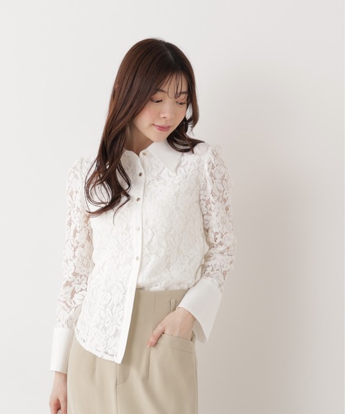 レディライクなシルエットが新鮮なレースシャツブラウス。 ウエストに沿ったキレイなラインと、大きめの襟が女性らしさを引き立てます。 フレア感のある大きめカフスで華やかさをプラス。カジュアルなパンツ合わせでもフェミニンな印象を演出してくれます。 <素材> レース、薄手ポリエステル素材を使用しています。 <詳細> 仕様・前ボタン 裏地・あり 透け感・あり / 光沢・なし / 伸縮性・なし 生地の厚さ・普通 ※モデルの着用画像の場合、光の当たり具合により、実際の色味と異なって見えることがございます。 色味は、商品単体の画像をご参照ください。 <商品のお気に入り登録> お気に入りアイテムの値下げ・再入荷・在庫1点などの通知を受け取ることができる 便利機能ですので気に入ったアイテムはお気に入り登録がおすすめ! <ショップのお気に入り登録> 新商品や再入荷、セール、クーポン配布などお得な情報を受け取ることができます。 ●撮影はサンプル商品で行っている為、仕様とサイズが異なる場合がございます。 ●スタジオ及び屋外で撮影した着用画像は、光の当たり具合で色味が違って見える場合があります。予めご了承ください。