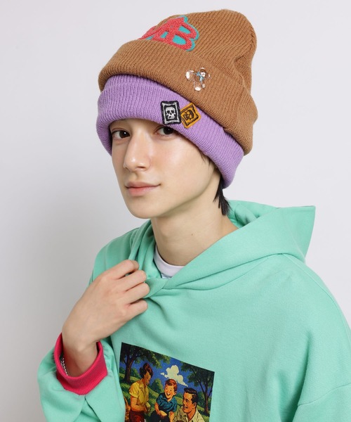 MILKBOY 2026 SPRING ・ニット帽をレイヤードしたようなデザインが特徴で、ボリューミーかつ個性的なニットキャップ ・ロゴやサンドウィッチ、クマやガイコツなどワッペンで遊び心を加えた、コーデのプラスワンアイテム! ※ガイコツワッペンはアソートになります ~ Colors ~ A,キャメル×ラベンダー B,ブラック×キャメル ~ Material ~ 毛56% , 綿27% , ナイロン17%