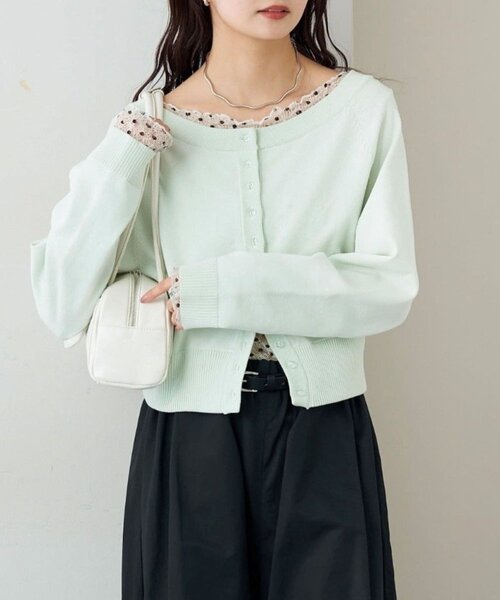 ワイドネックデザインでデコルテラインをキレイに見せてくれるカーディガン●デザイン・ワイドネックデザインが、デコルテラインをキレイに魅せてくれます。・クリアボタンが軽やかなアクセントになり、抜け感をプラスしてくれます。・程よくフィットするシルエットで、女性らしさを引き立ててくれる一枚です。●スタイリング・デニムを合わせて、程よくカジュアルダウンした着こなしに。・ミニボトムを合わせると可愛いフェミニンスタイルが完成します。・インナーにレースやシアートップスを合わせたレイヤードスタイルにも◎●おすすめスタイリングアイテムフェイクレザーミニスカートクラッシュカーブパンツビューティーフレアデニム●素材/取り扱い方法-----------------------------------------------------洗濯:40度限度 手洗い/石油系ドライクリーニング可アイロン:低温120℃まで(あて布使用)タンブル乾燥:不可裏地:なし伸縮性:なし光沢感:なし生地の厚さ:普通------------------------------------------------------商品のお気に入り登録➡ お気に入りアイテムの値下げ・再入荷・在庫1点などの通知を受け取ることができます。ブランドのお気に入り登録➡ 新商品や再入荷、セール、クーポン配布などお得な情報を受け取ることができます。※サイト上のカラー名と、お届け商品に記載されているカラー名が異なる場合がございます。※商品の色味は、撮影場所や光のあたり具合などにより色味が違って見える場合が御座います 。 また、お客様のお使いのPCのモニター環境などにより色味が違って見える場合が御座います。予めご了承の上ご注文下さい。※ご注文いただいた予約商品のお届け時期の確認は、注文履歴ページより行えます。------------------------------------------------------